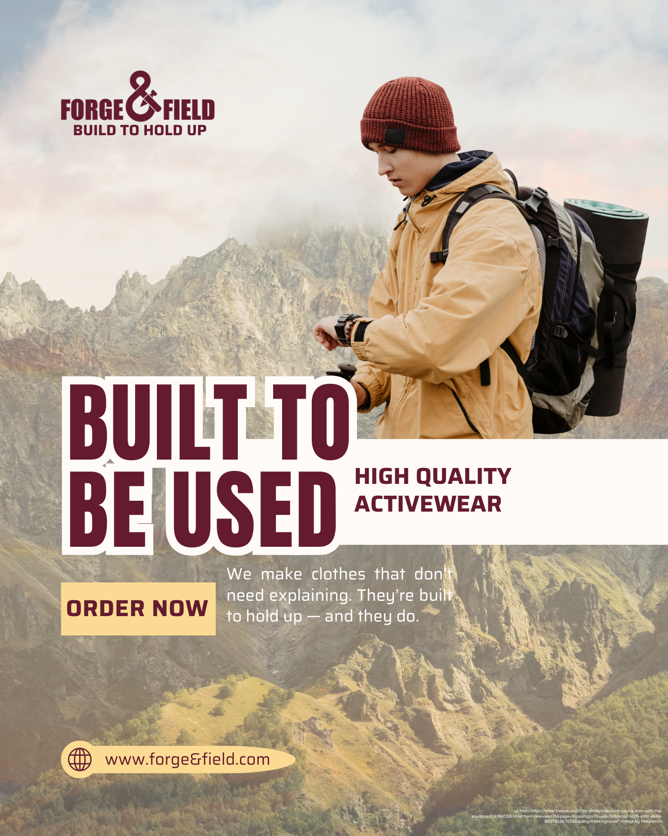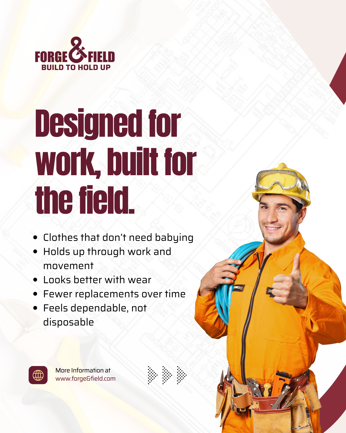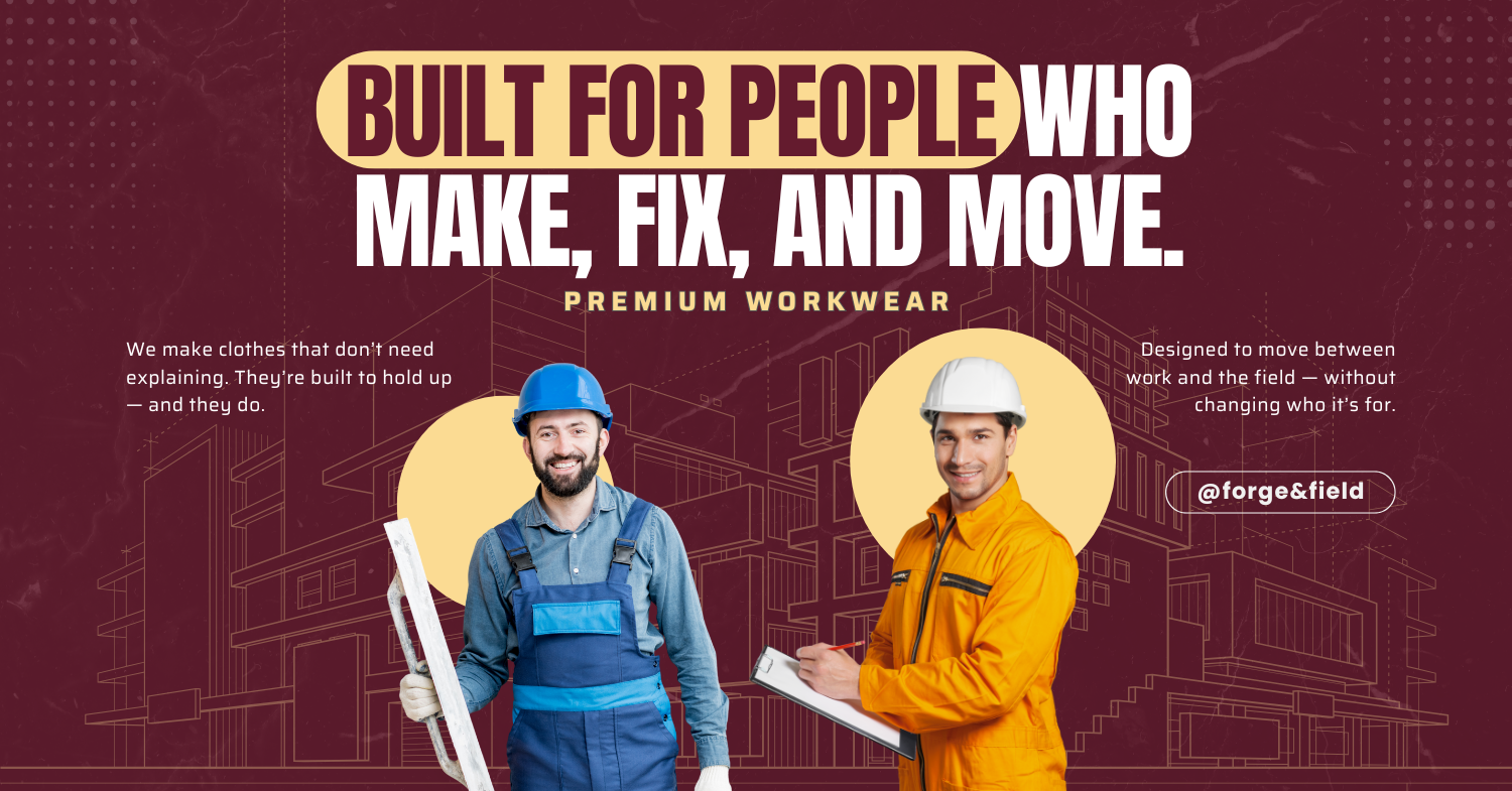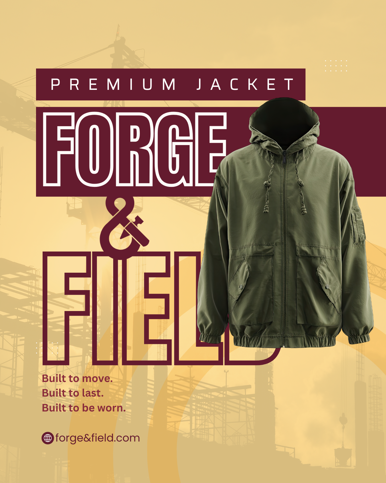FORGE & FIELD is a workwear and outdoor apparel brand built around durability, utility, and real use. Designed for makers and outdoor workers, the brand favours function-first design, timeless aesthetics, and strong, patch-ready visuals.